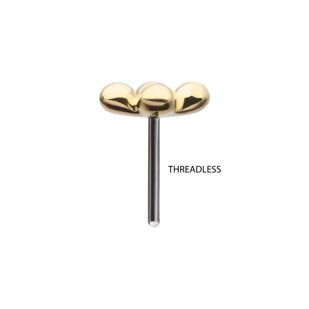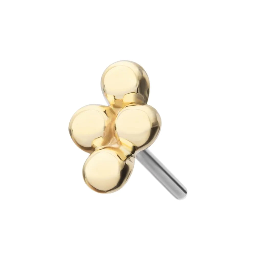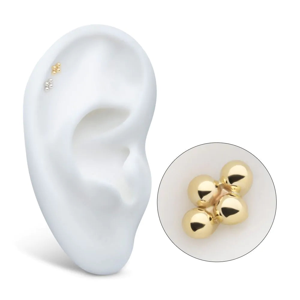 14Kt Gold Threadless 4-Bead Cluster Top. Made of solid 14kt nickel-free Gold with durable 316LVM ASTM F-138 Implant Grade Steel Pin designed to be practical and easy to use. Fits all sizes of pins and bases in our threadless body jewelry line. Pin Size: 0.45mm x 4.7mm.
