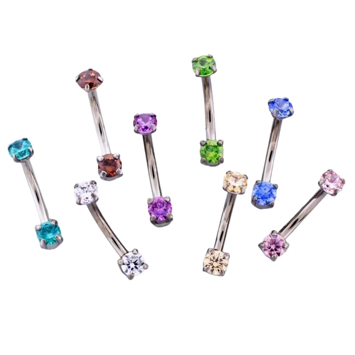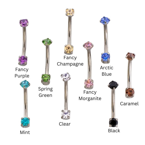 316L steel internally threaded curve with prong-set 3mm premium zirconia gem. The bottom gem is fixed.