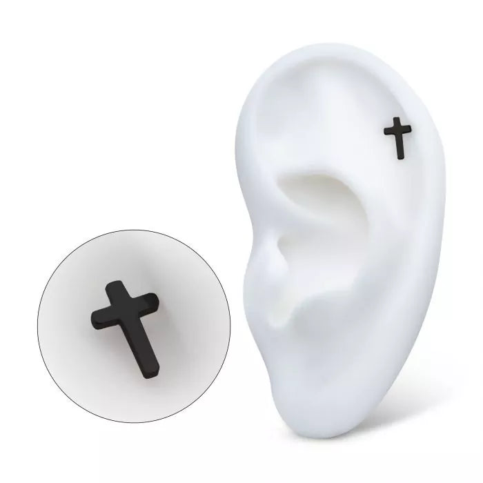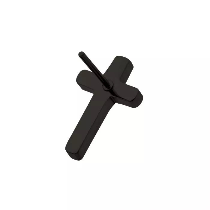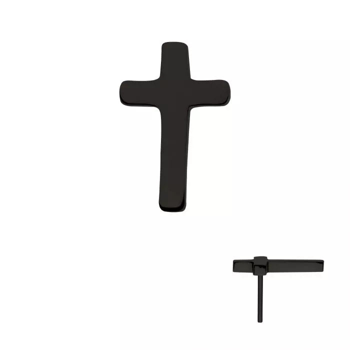 Black PVD Titanium Threadless Cross Top. This Threadless Top is made from Implant Grade Titanium TI-6AL-4V ELI ASTM F136 with 25g durable Titanium Pin designed to be practical and easy to use. Fitting all sizes of pins and bases in our threadless body jewelry line. Pin Size: 0.45mm x 4.7mm.