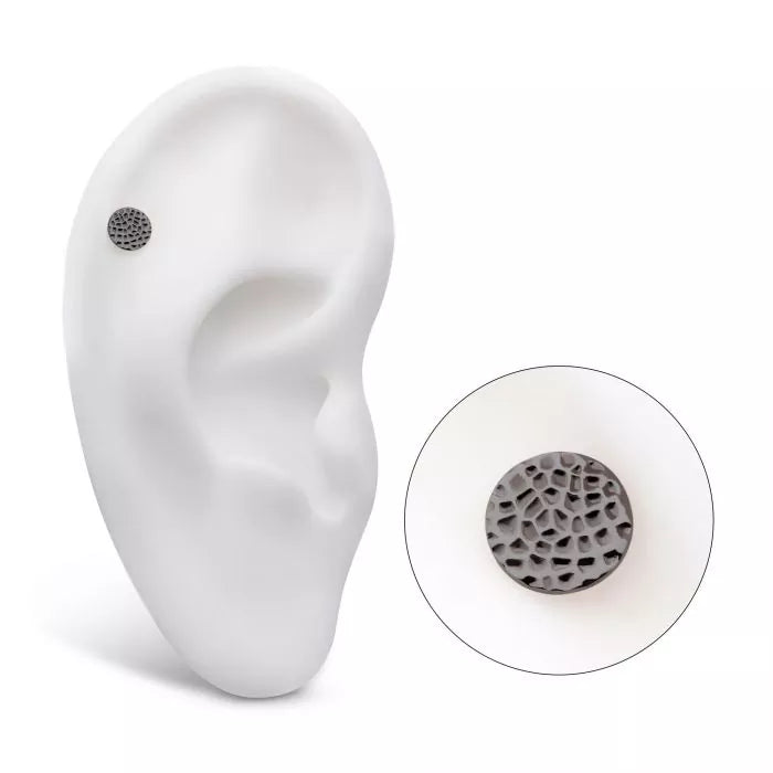 Black PVD Titanium Threadless Hammered Disk Top. These Threadless Tops are made from Implant Grade Titanium TI-6AL-4V ELI ASTM F136 with 25g durable Titanium Pin designed to be practical and easy to use. Fitting all sizes of pins and bases in our threadless body jewelry line. Pin Size: 0.45mm x 4.7mm.