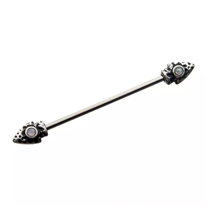14g 1 3/8" Surgical Steel with Synthetic White Opal Forward Facing Antiqued Arrow Industrial Barbell.