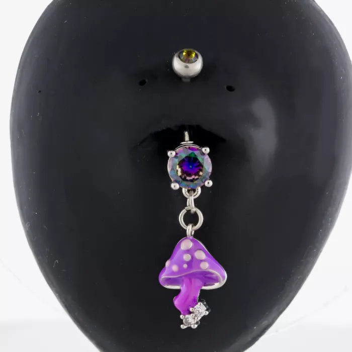 14G 3/8 5MM TOP GEM BALL AND 8MM BOTTOM BALL WITH PURPLE MUSHROOM WITH CLEAR GEMS