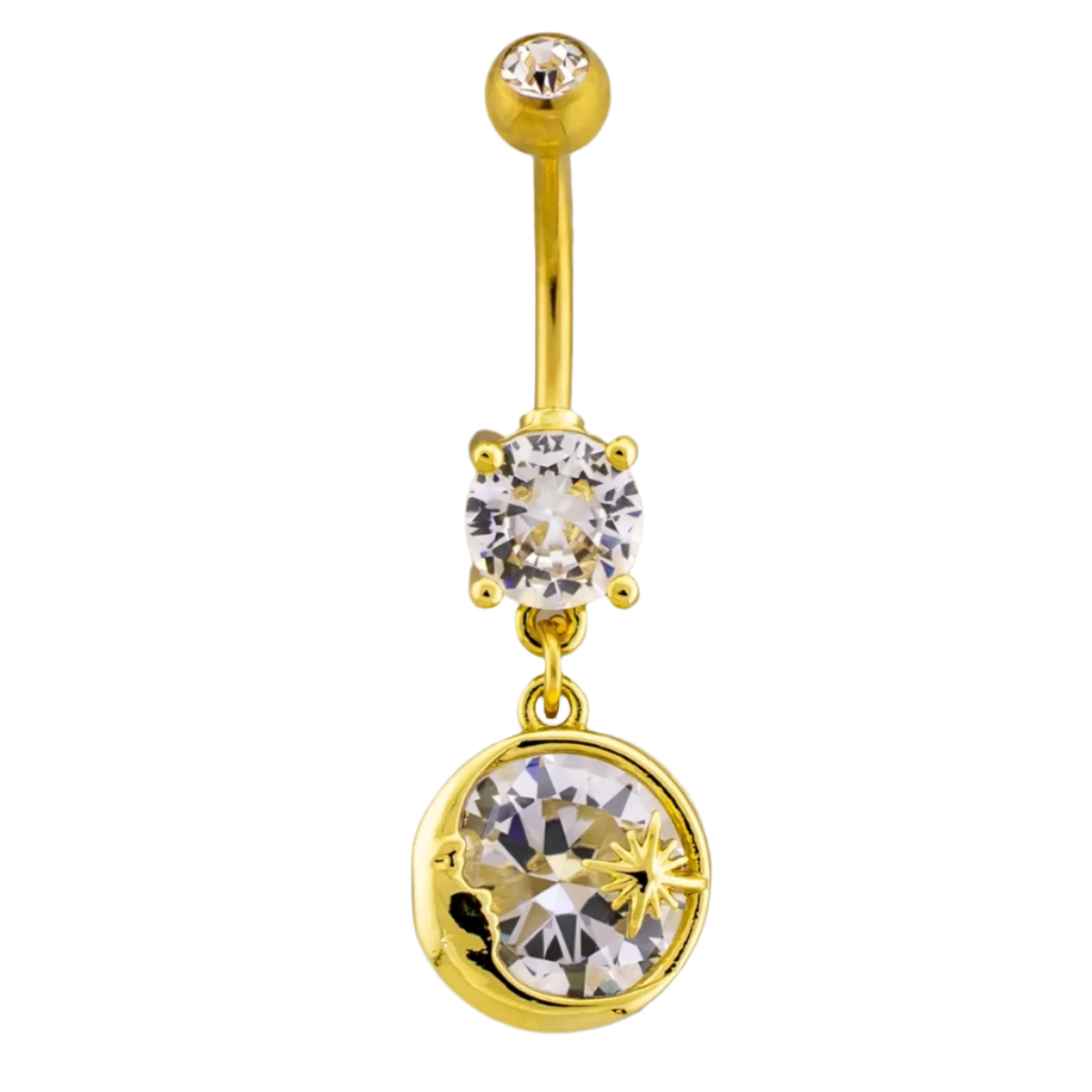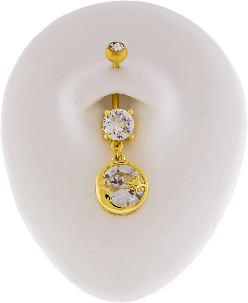 14G 3/8" Navel Barbell w/ Crescent Moon Framed Gem. Gold PVD barbell with 5mm x 8mm clear prong set gem. Moon charm frames clear gem and star.