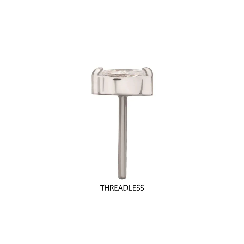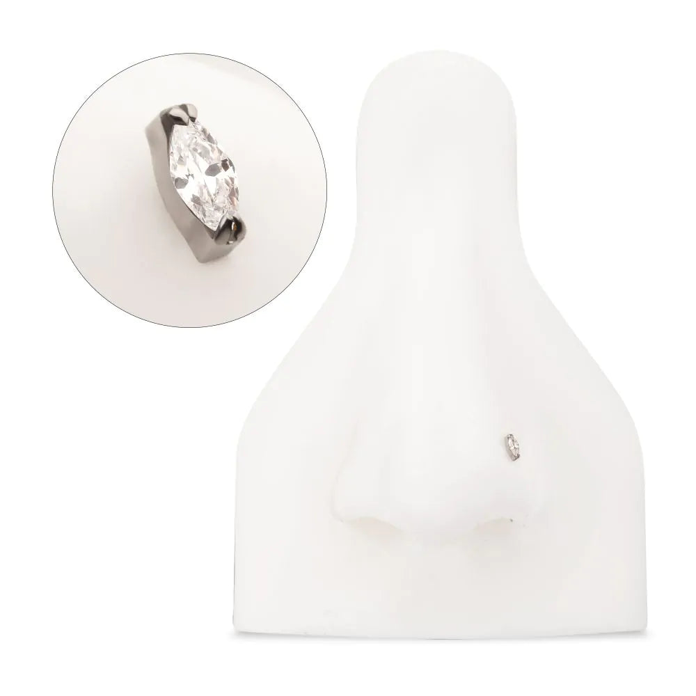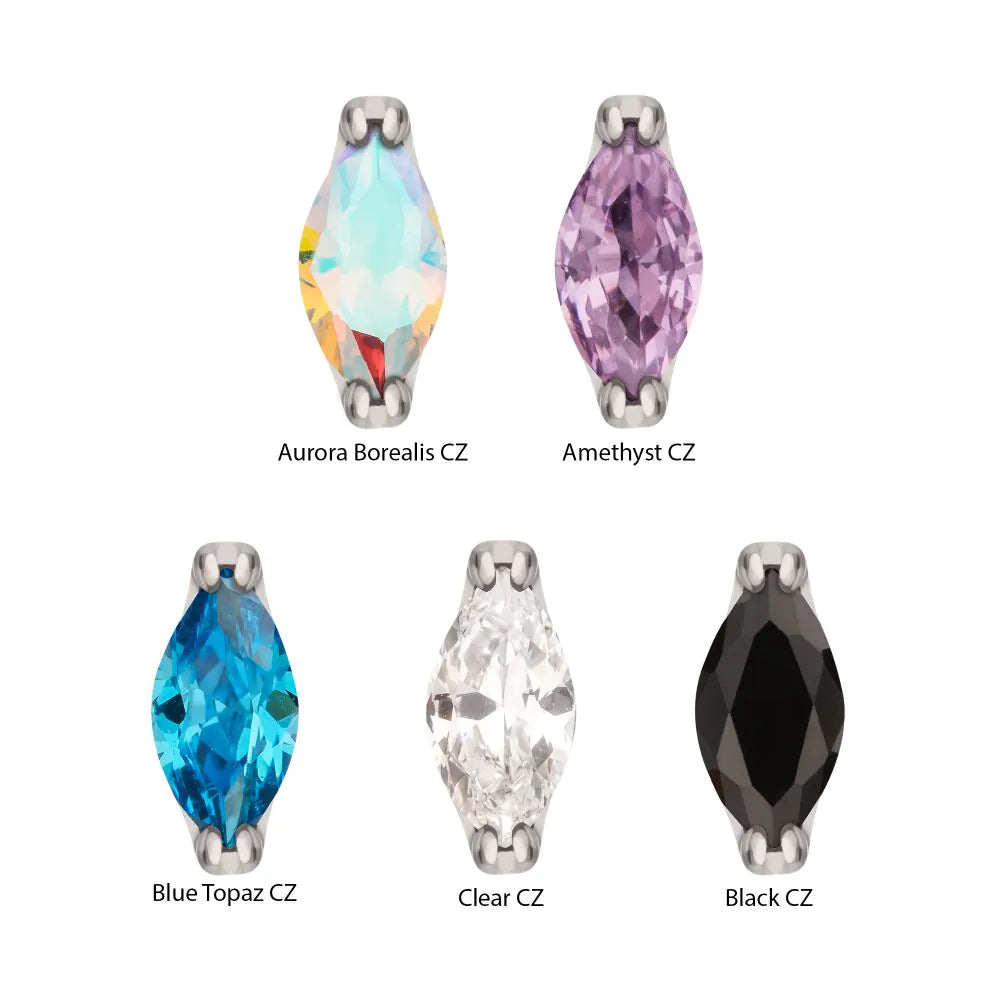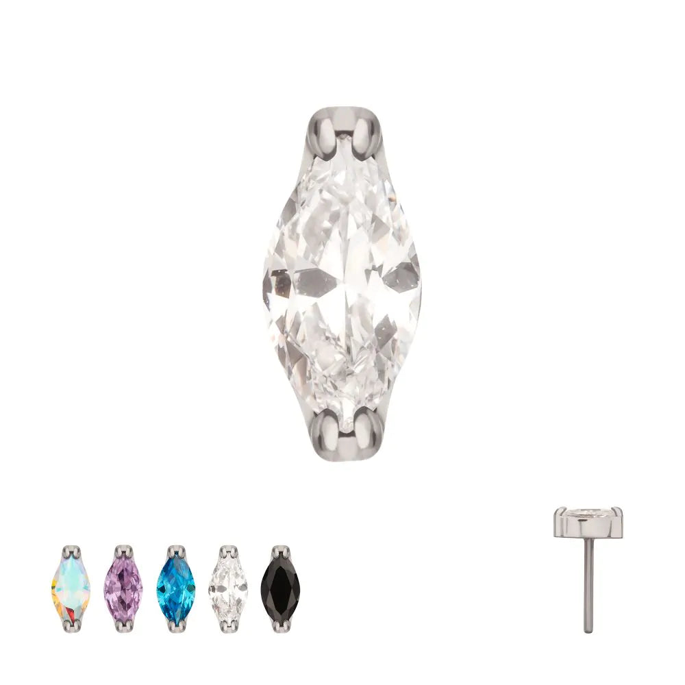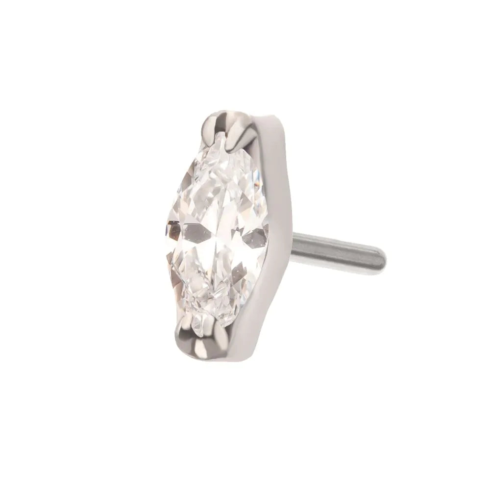 Titanium Threadless Double V-Prong 3mm Marquise Gem Top. Made from Implant Grade Titanium TI-6AL-4V ELI ASTM F136 with 25g durable Titanium Pin designed to be practical and easy to use. Fitting all sizes of pins and bases in our threadless body jewelry line. Pin Size: 0.45mm x 4.7mm.